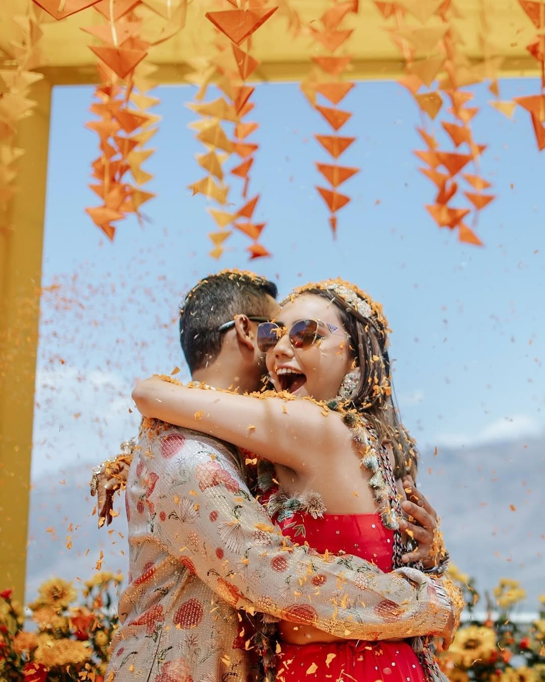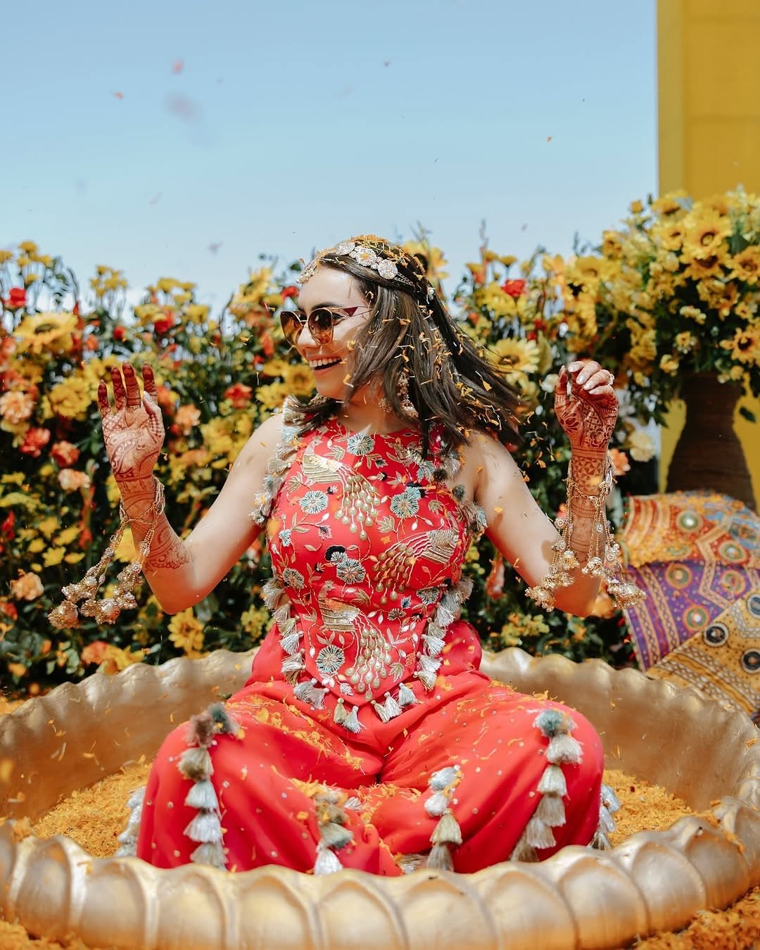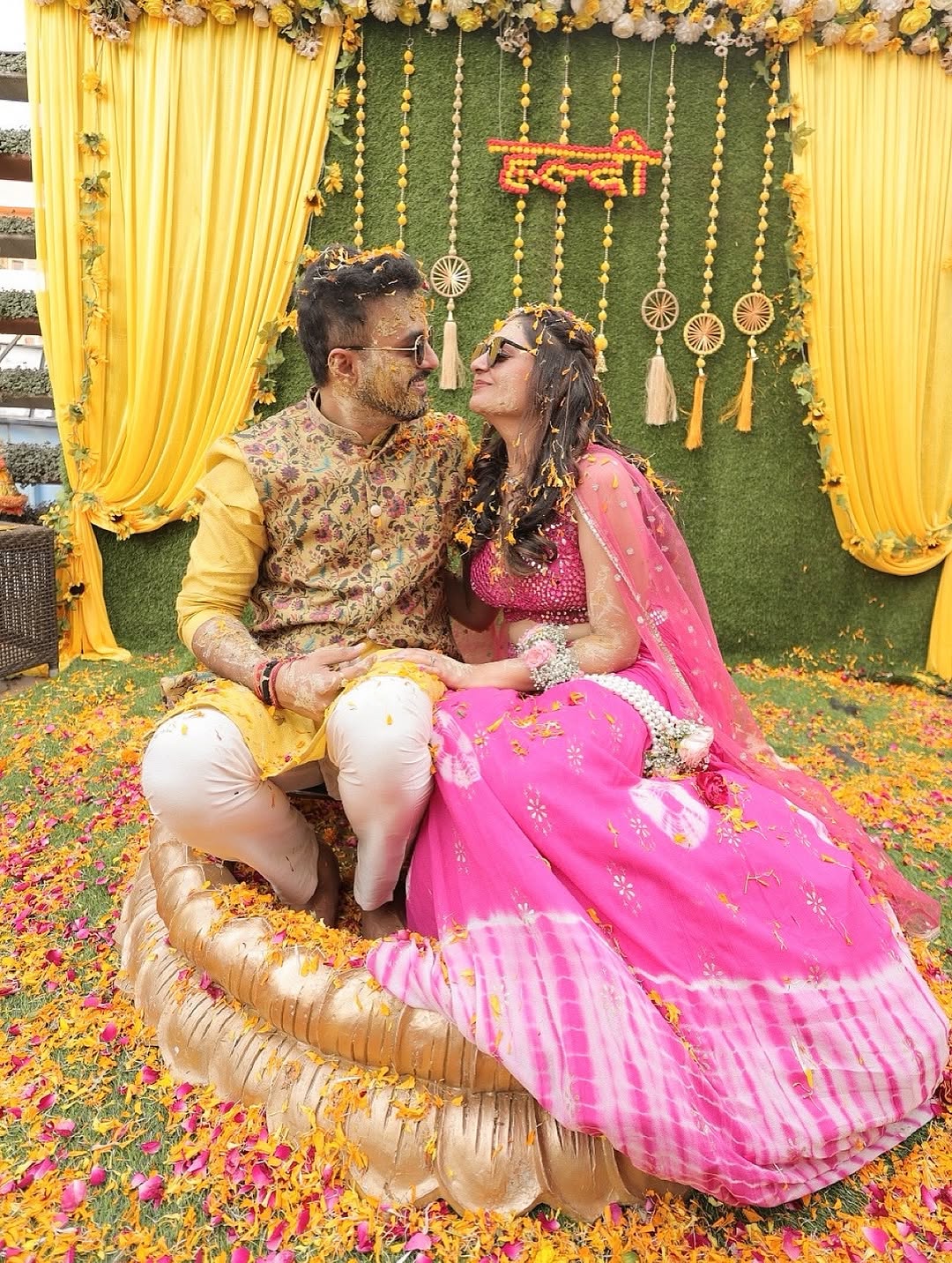 Elegant Phoolo ki Haldi décor with vibrant marigolds & fresh petals